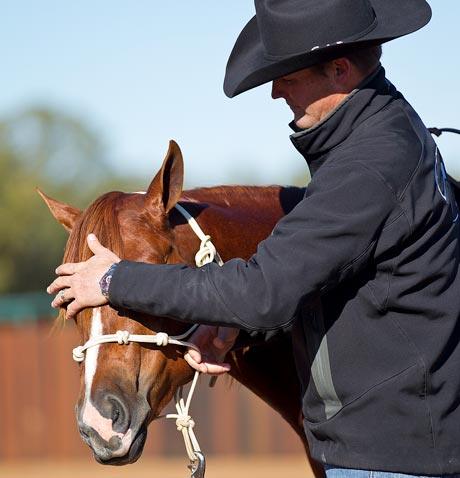 Step 1: Stand on the left side of the colt facing the same direction that he is facing. Using the Touch and Rub: Poll exercise, lower the colt’s head to your belt level. Then tip his head toward you by pressing the right side of his jaw with your fingertips.