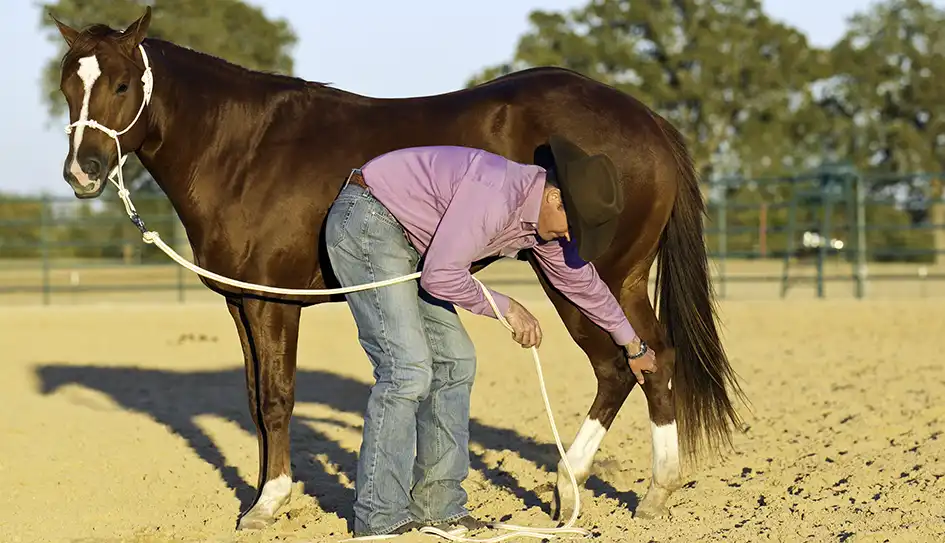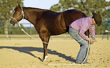 Using the lead rope to pick up his foot allowed me to stay a safe distance away from his hind leg in case he did kick out and proved to him that I wasn’t trying to hurt him. He thought that every time he felt pressure around his leg it was going to be a battle. I wanted to be casual about the whole thing and show him that as long as he responded by taking the weight off his leg, he’d get a release of pressure.