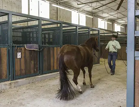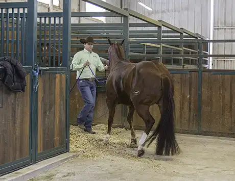 While you want the horse to calmly walk into and out of the stall, don’t be surprised if he initially trots through it. Don’t try to stop him from trotting, because that will only make him more nervous. Just keep sending him in and out of the stall until he relaxes on his own and walks.