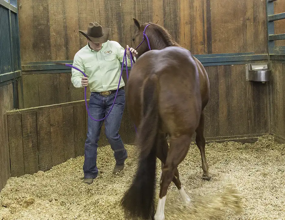 It doesn’t matter how you move the horse’s feet, just that you do as many changes of direction as you possibly can. A great exercise to practice is Lunging for Respect Stage Two, where you’ll ask the horse to trot energetically in a circle around you and then yield his hindquarters and roll back into the opposite direction he was going.