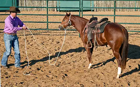 14 Let the colt trot around the roundpen a few times, and then yield his hindquarters to bring him to a stop so that you can tighten up the front cinch. Remember to leave your stick and string way out in front of the colt. Approach the colt at a 45-degree angle to his shoulder and keep his head tipped toward you as you tighten the cinch up.
