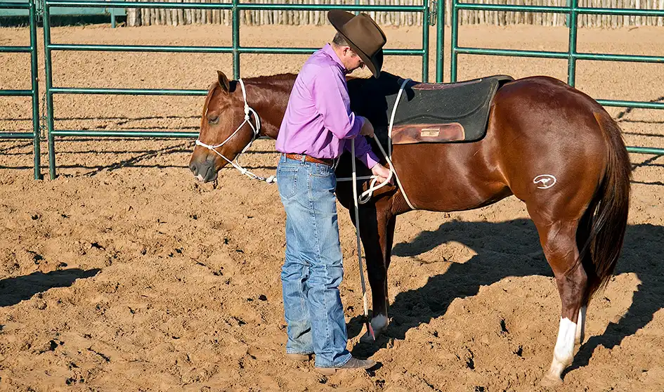 Make sure that when you’re doing up the back cinch, you’re still standing up by the colt’s shoulder. Never reach for the back cinch underneath the colt without letting him know you’re coming. If you take him by surprise, he’s likely to use the reactive side of his brain and kick out at you and then start bucking. So always warn him by rubbing underneath his belly first.