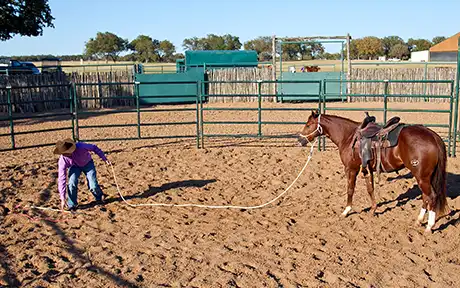 It’s very important to get the colt cantering. When he canters, the stirrups will bump against his sides, the saddle will move on his back, and the cinches will pull on him in different ways than at the trot. Some colts will be fine at the trot, but as soon as you ask them to canter, they’ll start bucking. Don’t worry about trying to make the colt lunge a perfect circle; just hold the end of the lead rope and let him follow the outside of the roundpen. Run a little bit yourself if you have to in order to give him enough room to canter.