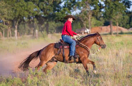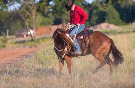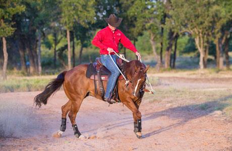 If a horse is flat out galloping, you’ll have to spiral the horse down in a tighter and tighter circle until he eventually stops. Because he’s going so fast, pulling abruptly on one rein could throw him off balance and it’ll take longer to get his feet to stop. The secret there, though, is to not let the horse build his speed up to 90 miles an hour and then worry about how you’re going to stop him. Shut him down before he gets out of control.