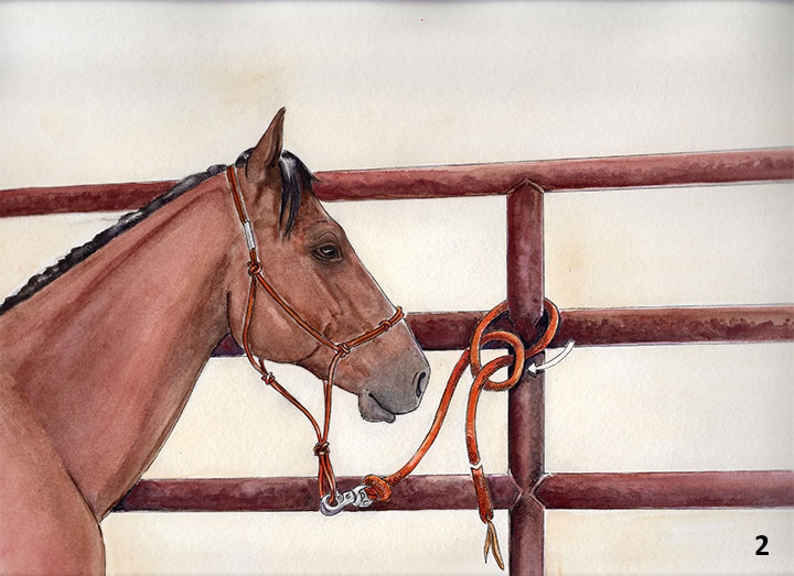 Lay the lead rope across your left hand with the free end hanging down. Form a small loop in the line in your hand by taking the free end of the rope over, not under, the line in your hand. Then pass the free end of the rope behind the pole, or whatever you’re tying your horse to.